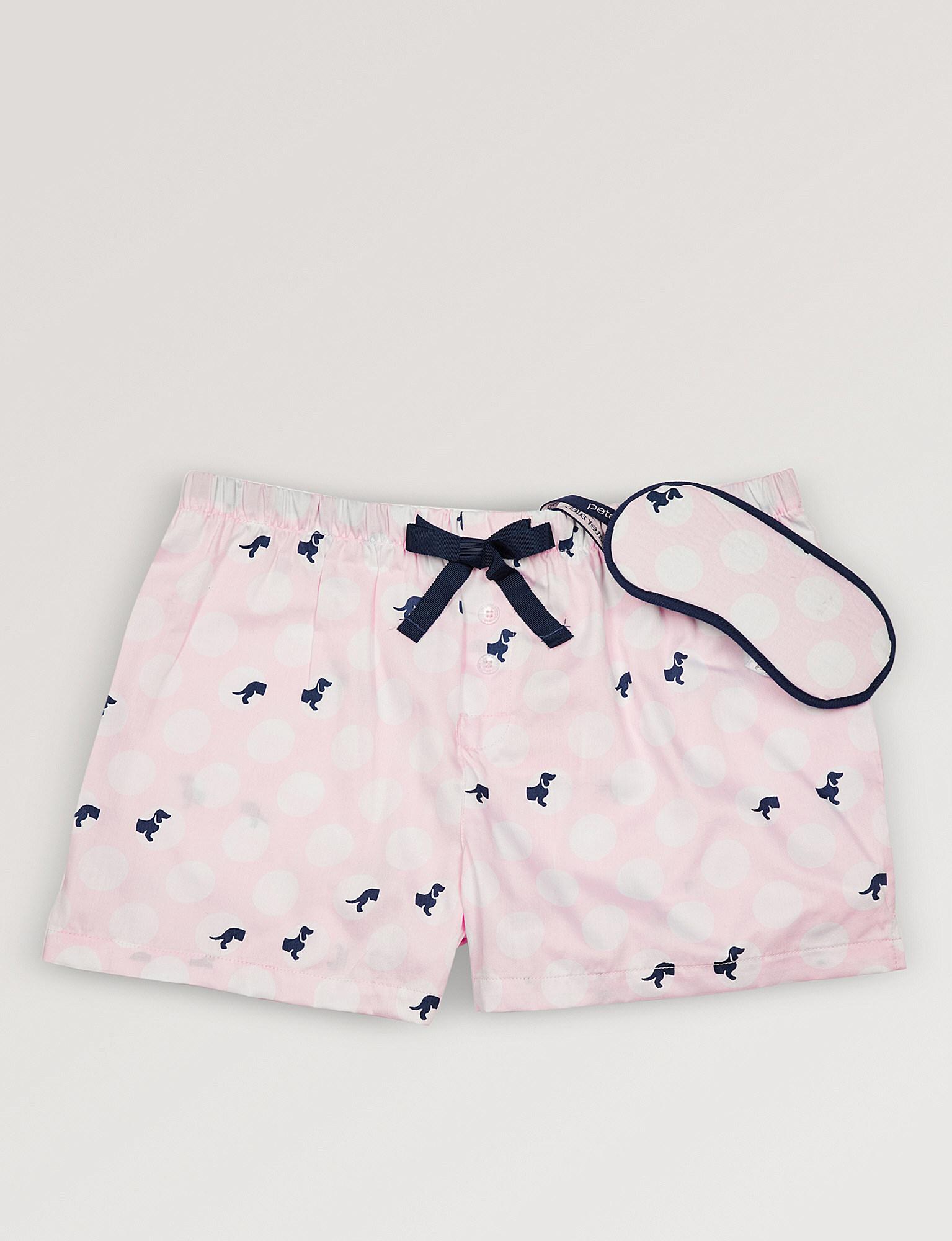 Peter Alexander Pink Eye - Button Up Shirt With Collar Two Front Pockets Short Sleeves Matching Straight Leg Pj Pants Elasticised Waistband Drawstring Comes With Matching Eye Mask Brand: